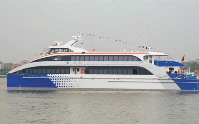 450客雙體高速客船船體及上建材料;鋁合金總長:39.95米 型寬:10.70米 型深:3.8米 吃水:1.65 米 航速:36 節(jié) 主機:2xmtu